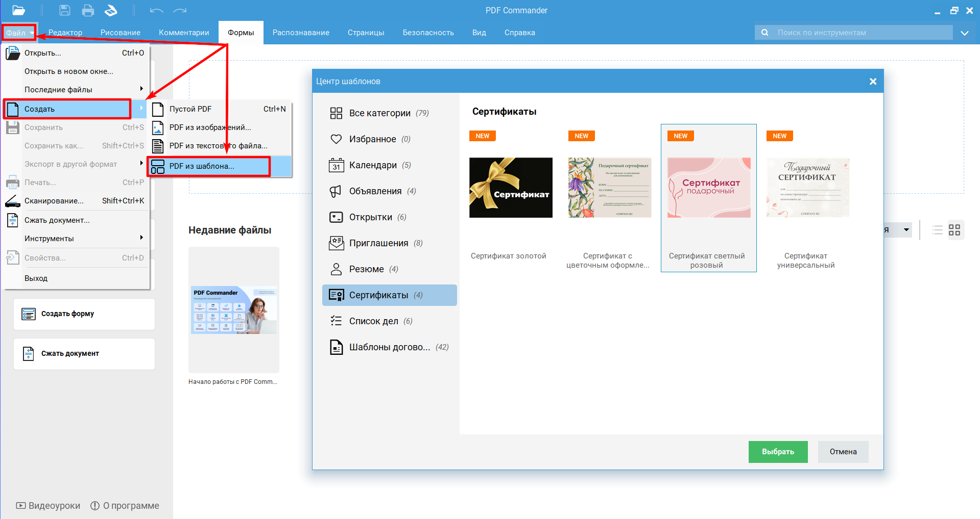 1. Запустите приложение. На начальной странице кликните «Файл» – «Создать» – «PDF из шаблона». В появившемся меню перейдите в «Сертификаты», выберите подходящий макет и щелкните «Открыть».