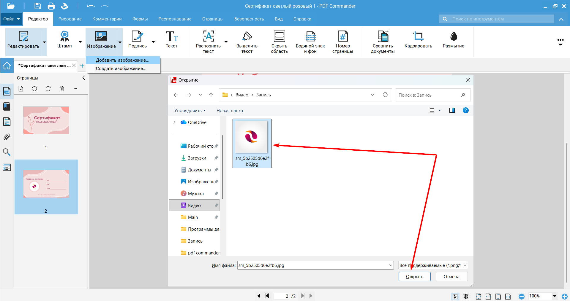 4. Также здесь можно добавлять собственные изображения, например логотип компании, бренд и QR-код для быстрой регистрации. Для этого с помощью виджета «Изображение» выберите «Добавить изображение». В открывшемся Проводнике выделите вашу картинку, затем – «Открыть».