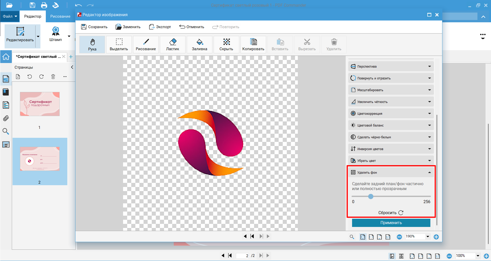 5. Желательно загружать собственные изображения без фона в формате PNG, так будет проще вписать логотип в общий дизайн подарочного сертификата. Если же у вас есть лишний задний план, нажмите по картинке правой кнопкой мыши, выберите пункт «Редактировать изображение». В новом окне найдите справа пункт «Убрать фон», поставьте ползунок на подходящее значение, например 60, и щелкните «Применить».