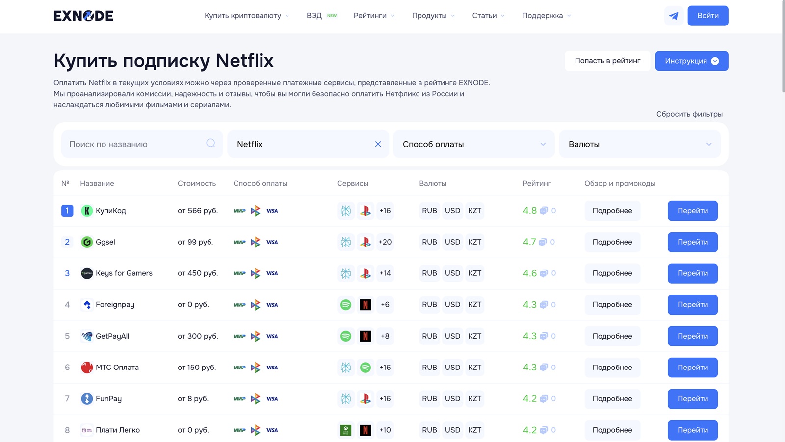 Шаг 1. Перейдите на сайт ExnodeЗайдите на Exnode, в фильтрах выберите нужный сервис. Система мгновенно покажет, где сейчас выгоднее всего оплатить заграничный сервис из России. Выберите подходящее предложение и перейдите на сайт выбранного партнёра.
