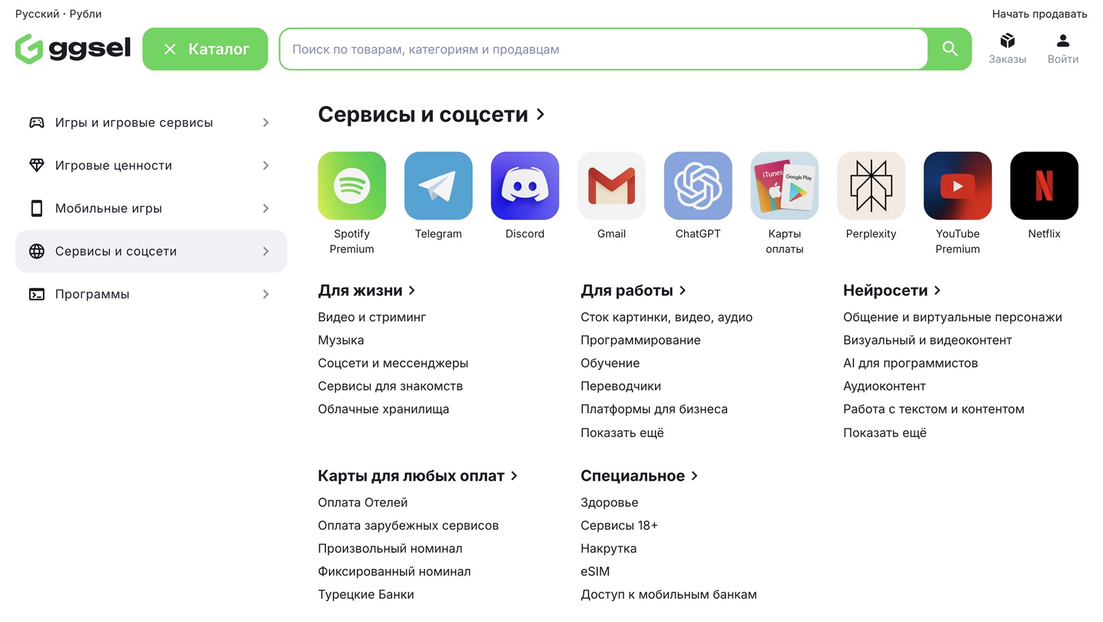 Ggsel – крупная площадка цифровых товаров, где оплата зарубежных сервисов стала максимально удобной и безопасной. Здесь собраны продавцы, предлагающие легальные коды и подписки для сотен платформ.