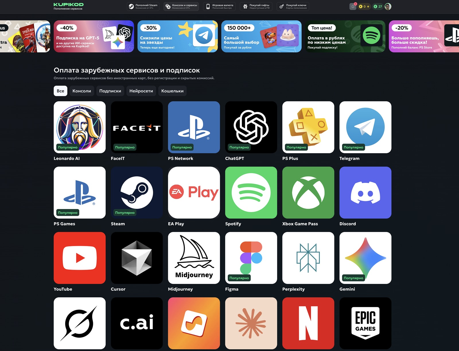 Купикод специализируется на продаже цифровых кодов и сертификатов для оплаты иностранных сервисов. Это один из самых понятных и быстрых способов оплатить иностранные сервисы из России, не проходя сложных верификаций.