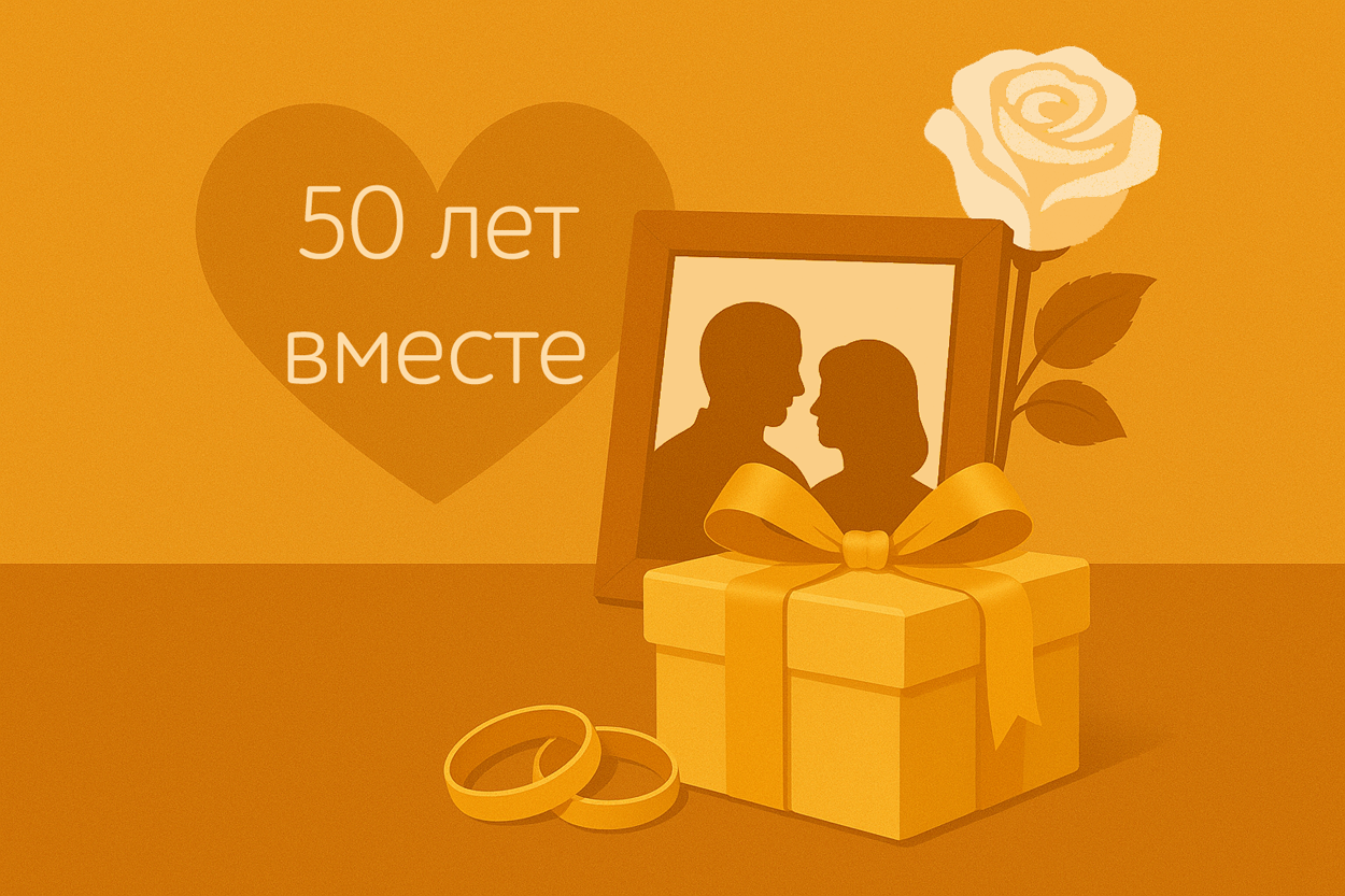 Принято считать, что символом 50-летия совместной жизни является золото — благородный металл, который не тускнеет со временем, как и настоящие чувства. Отсюда традиция дарить подарки в золотых, теплых оттенках, с использованием золотых деталей или украшений. Это может быть как ювелирное изделие, так и предмет интерьера, текстиль, посуда или памятный сувенир, но важно, чтобы за ним стояла эмоциональная ценность, а не только материальная.