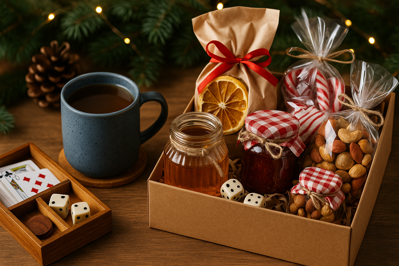 Мёд, пастила, орехи, джемы, пряники — всё, что можно съесть или разделить с семьёй. Это практично и вызывает приятные ассоциации с зимними каникулами.