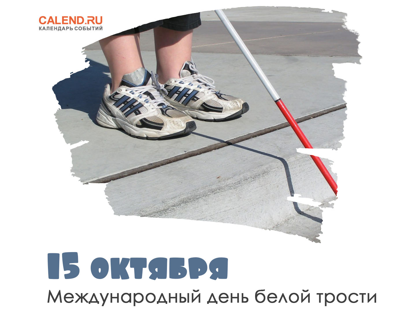 15 октябряМеждународный день белой трости привлекает внимание к проблемам незрячих людей во всем мире. Девиз Международного дня белой трости — «Толерантность, равноправие, интеграция». Очень важно всегда помнить о том, что люди с особыми потребностями обладают равными правами со всеми членами общества. Задача цивилизованного общества — помочь слепым и слабовидящим людям реализовать эти права и проявить свой потенциал. В первую очередь, это задача властей. Но и ответственность каждого человека — отнестись к инвалиду с уважением и тактом, не как к ущербному, а как к человеку с равными правами.