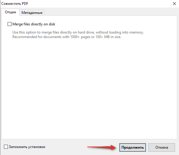 - Программа предложит выбрать файлы PDF для объединения. После указания нужных файлов откроется дополнительное окно с настройками. После установки нужных параметров следует нажать кнопку Продолжить.