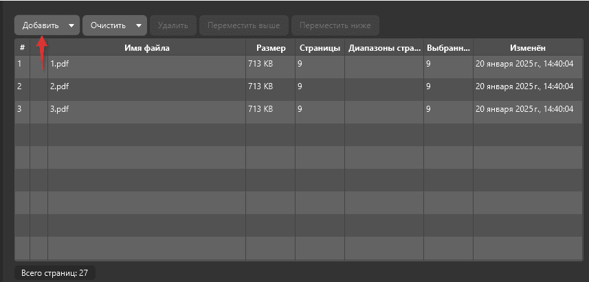- Теперь нужно добавить нужные PDF-файлы. Сделать это можно как перетаскиванием, так и с помощью кнопки Добавить.