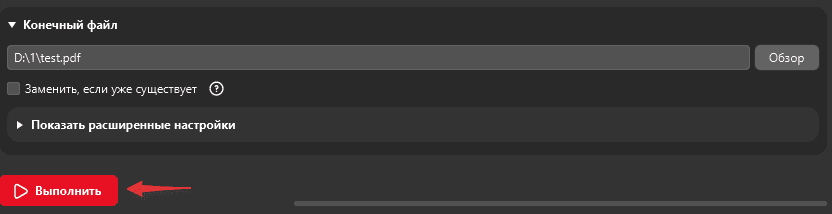 - Осталось указать папку для сохранения, имя итогового файла и нажать кнопку Выполнить.