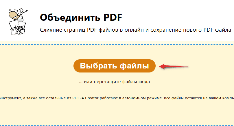 - Далее следует перетащить нужные PDF-файлы в рабочую область, либо добавить их для объединения с помощью кнопки Выбрать файлы.