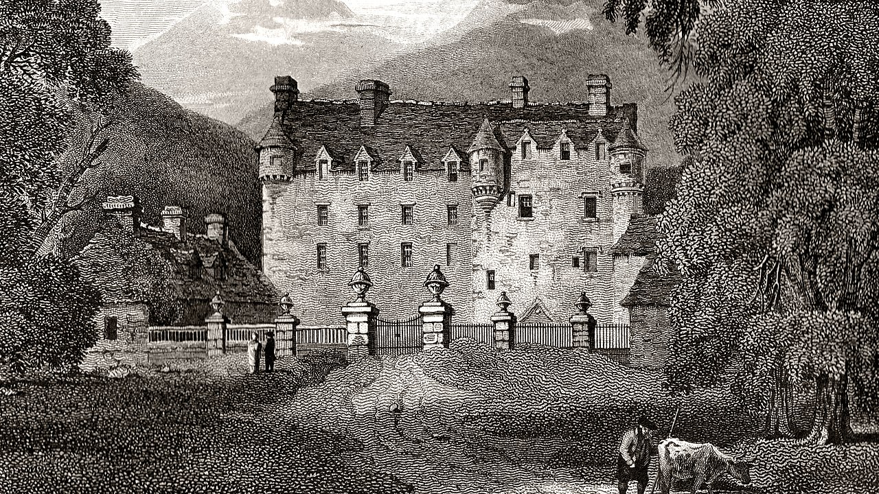 Замок Тракуэр, иллюстрация из книги «Приграничные древности» В. Скотта. Общественное достояние