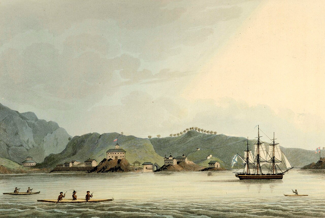 «Нева» в гавани Святого Павла на острове Кадьяк. Гравюра по рисунку Лисянского, общественное достояние